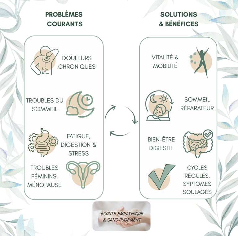 Plutôt que de simplement masquer un symptôme, nous cherchons ensemble les causes profondes de vos déséquilibres.